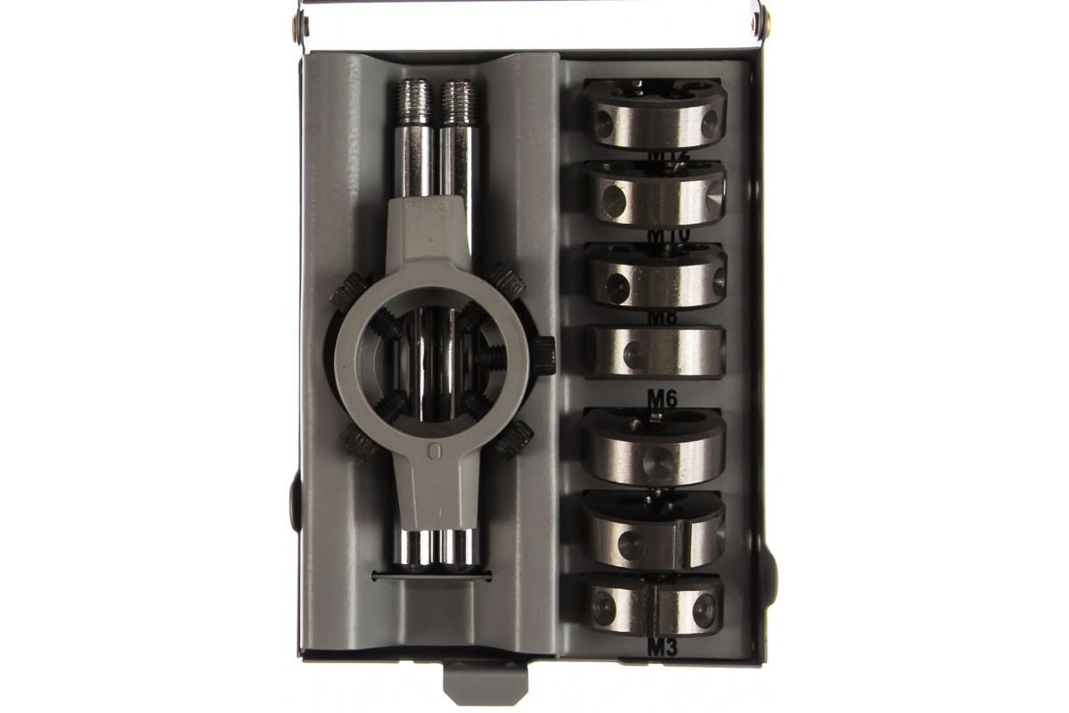 Набор круглых ручных плашек в железном мини-кейсе. Применяется для нарезания наружной метрической резьбы.