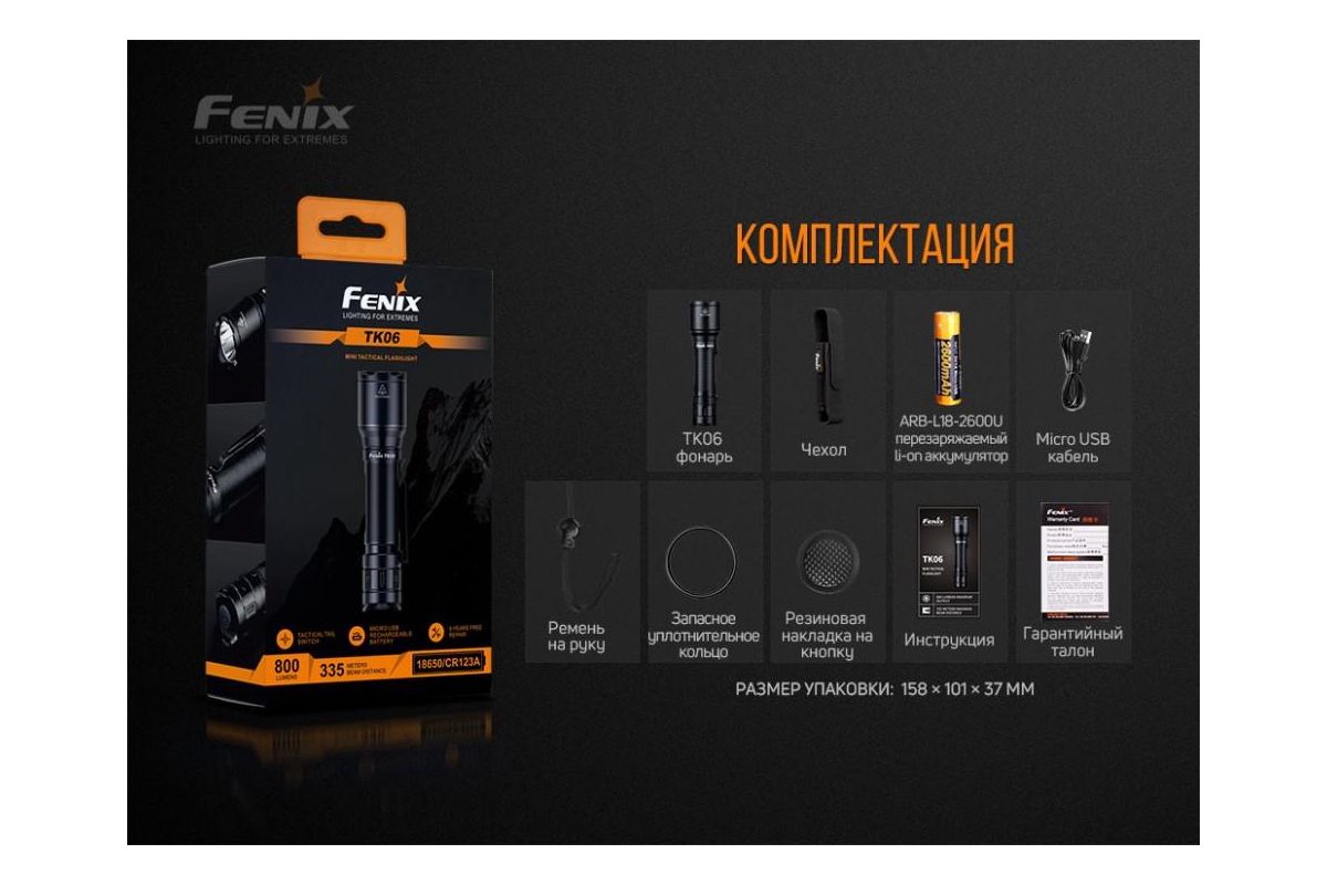 Комплектация: Фонарь TK06, аккумулятор ARB-L18-2600U Li-ion, кабель для зарядки Micro USB, ремешок на руку, чехол, запасное уплотнительное кольцо, запасная резиновая накладка на кнопку, инструкция, гарантийный талон.
